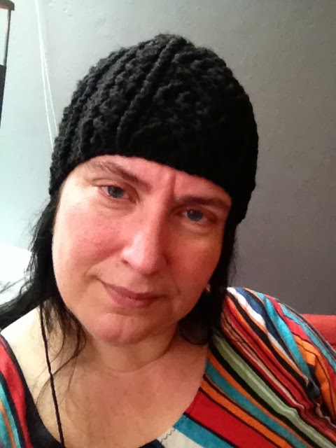 En last but not least... de mutsen. Het gaat gewoon door. Ik heb een nieuwe, zwarte poncho gehaakt, dus toen ik een prachtig gekabelde muts zag ik het boek Special techniques stitches in crochet, was ik compleet verkocht. Niet eenvoudig, maar wel wonderschoon! De muts dan ;P