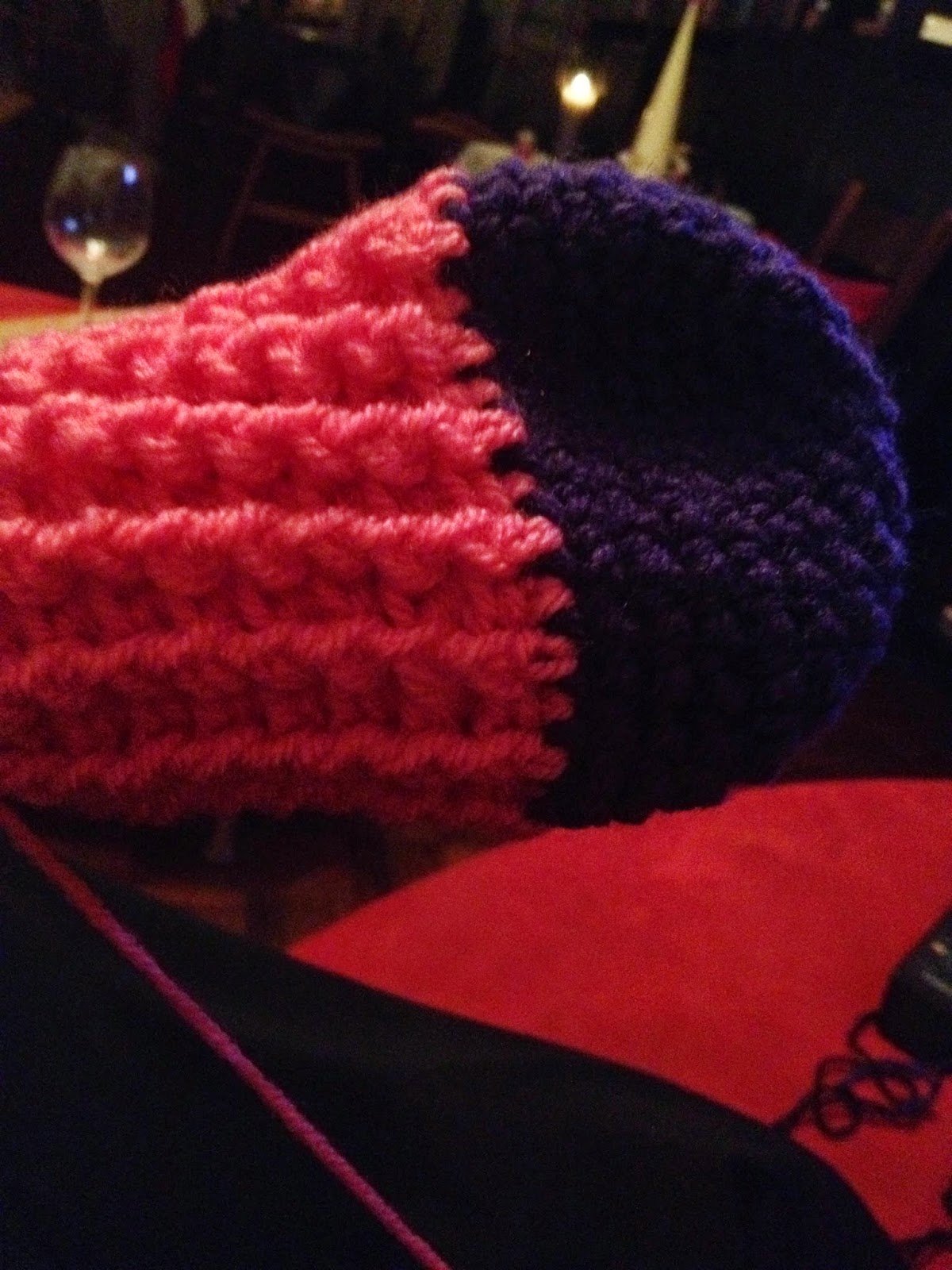 Maar om mijn handen op een gezellige manier bezig te houden en de voeten van mijn mama lekker warm, heb ik nog maar drie paar sokken gehaakt: donkerblauwe in mandjessteek met roze neuzen en hielen, roze in boordsteek met paarse neuzen en hielen en als laatste witte met roze streepjes.